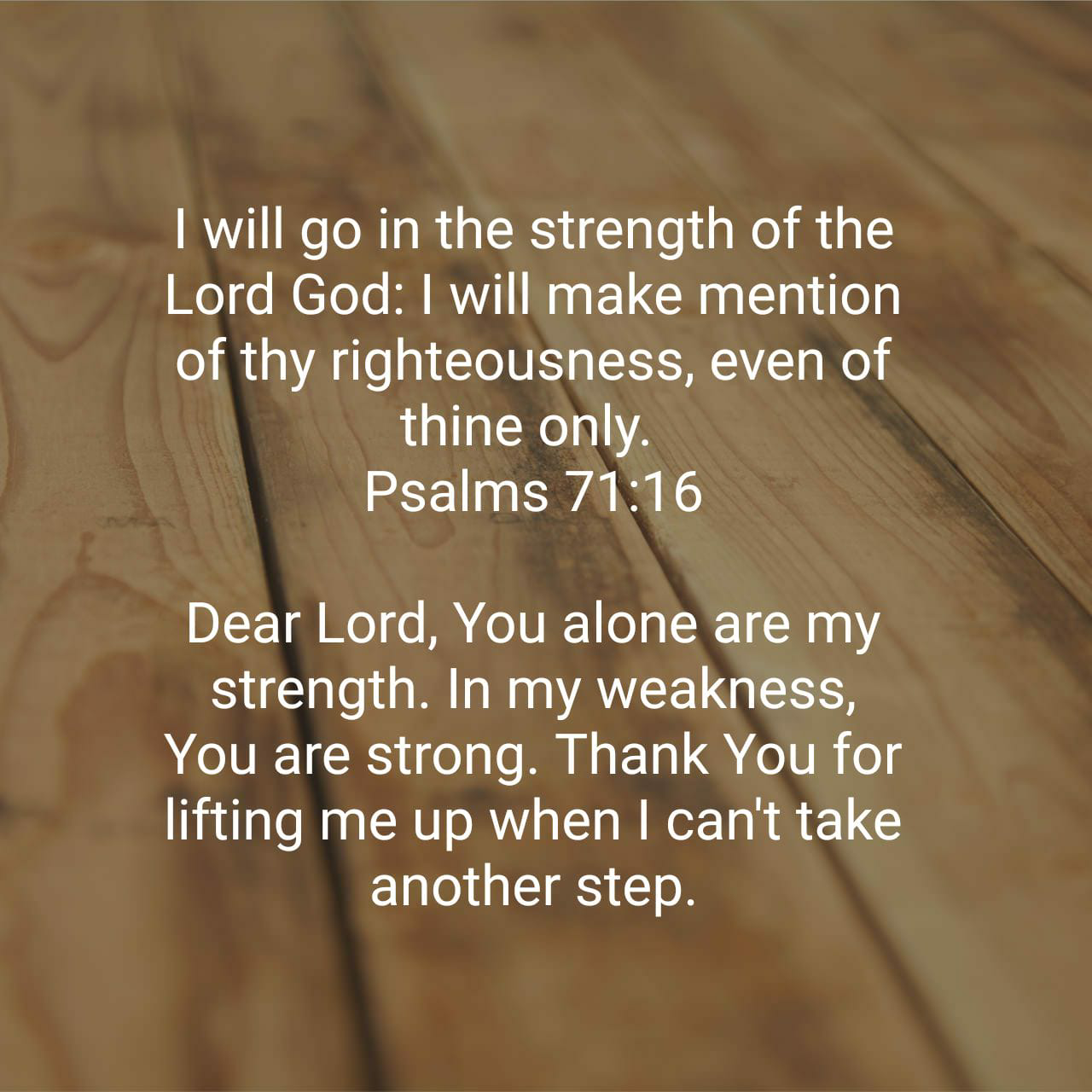I will go in the strength of the Lord God : I will make mention of thy righteousness, even of thine only. Psalms 71:16 KJV https://bible.com/bible/1/psa.71.16.KJV