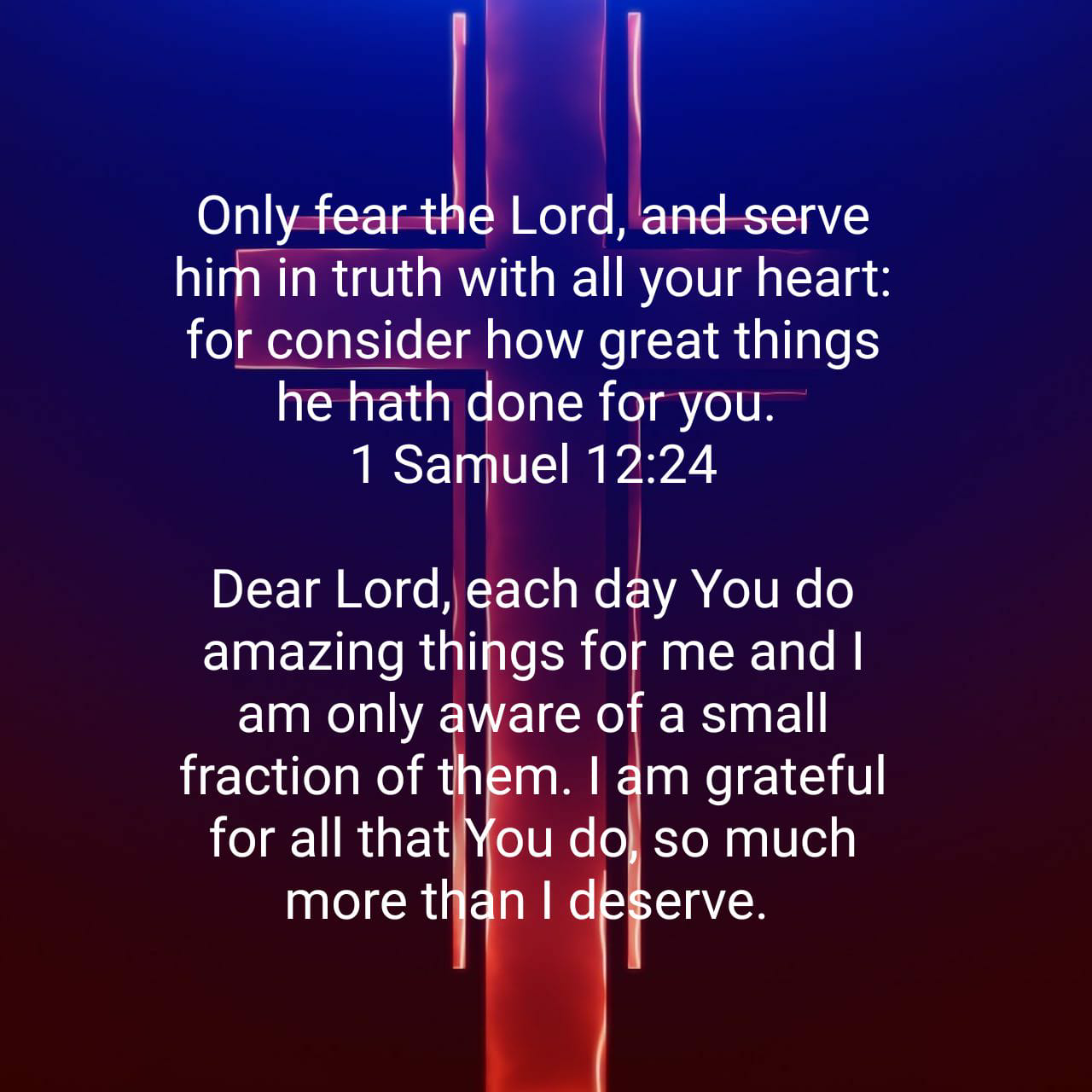 Only fear the Lord , and serve him in truth with all your heart: for consider how great things he hath done for you. 1 Samuel 12:24 KJV https://bible.com/bible/1/1sa.12.24.KJV