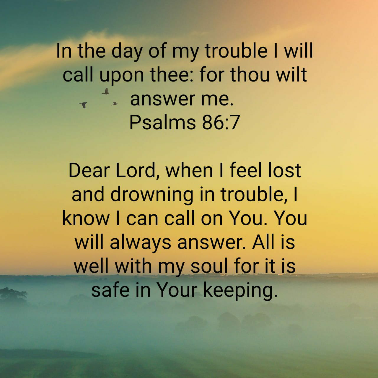 In the day of my trouble I will call upon thee: for thou wilt answer me. Psalms 86:7 KJV https://bible.com/bible/1/psa.86.7.KJV