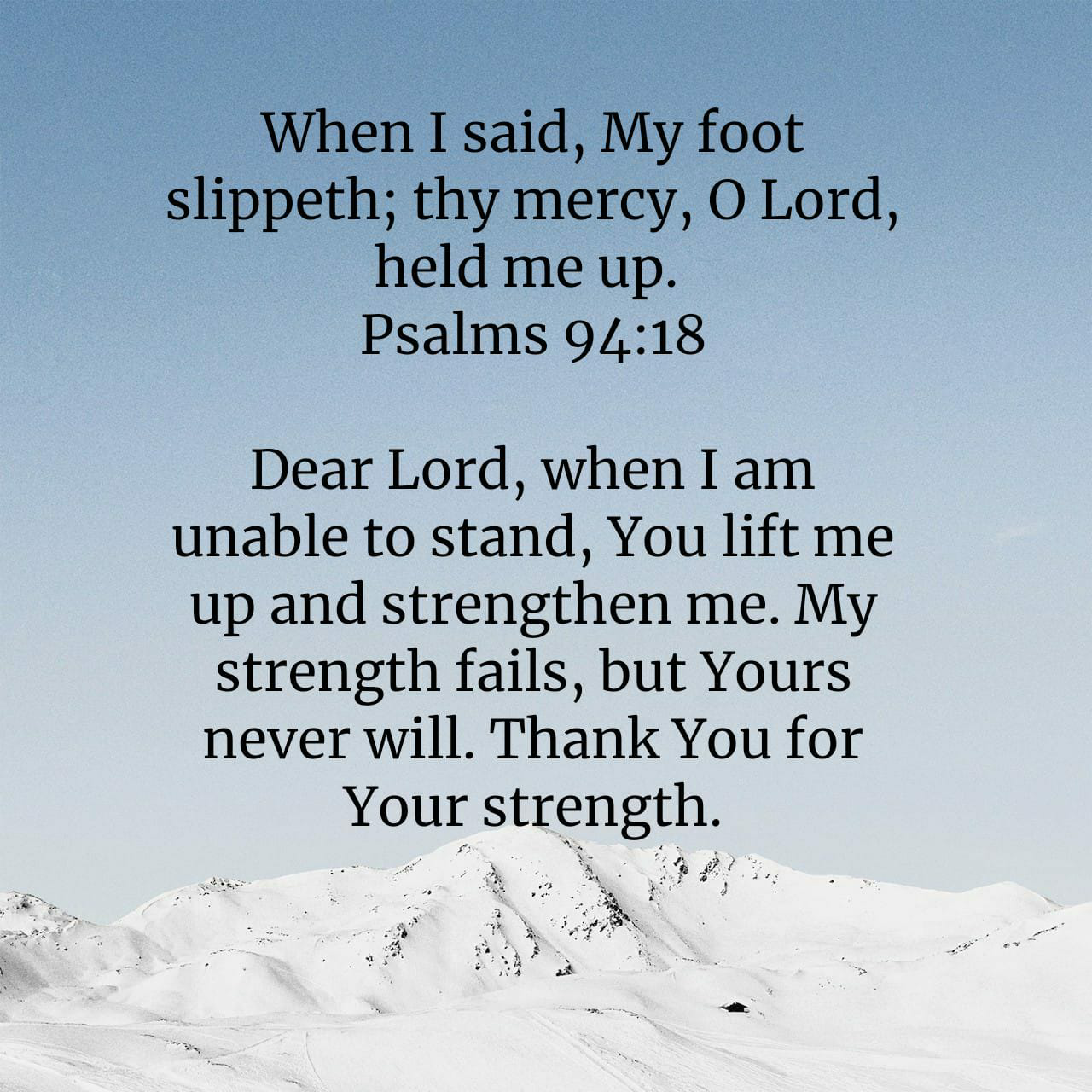 When I said, My foot slippeth; thy mercy, O Lord , held me up. Psalms 94:18 KJV https://bible.com/bible/1/psa.94.18.KJV
