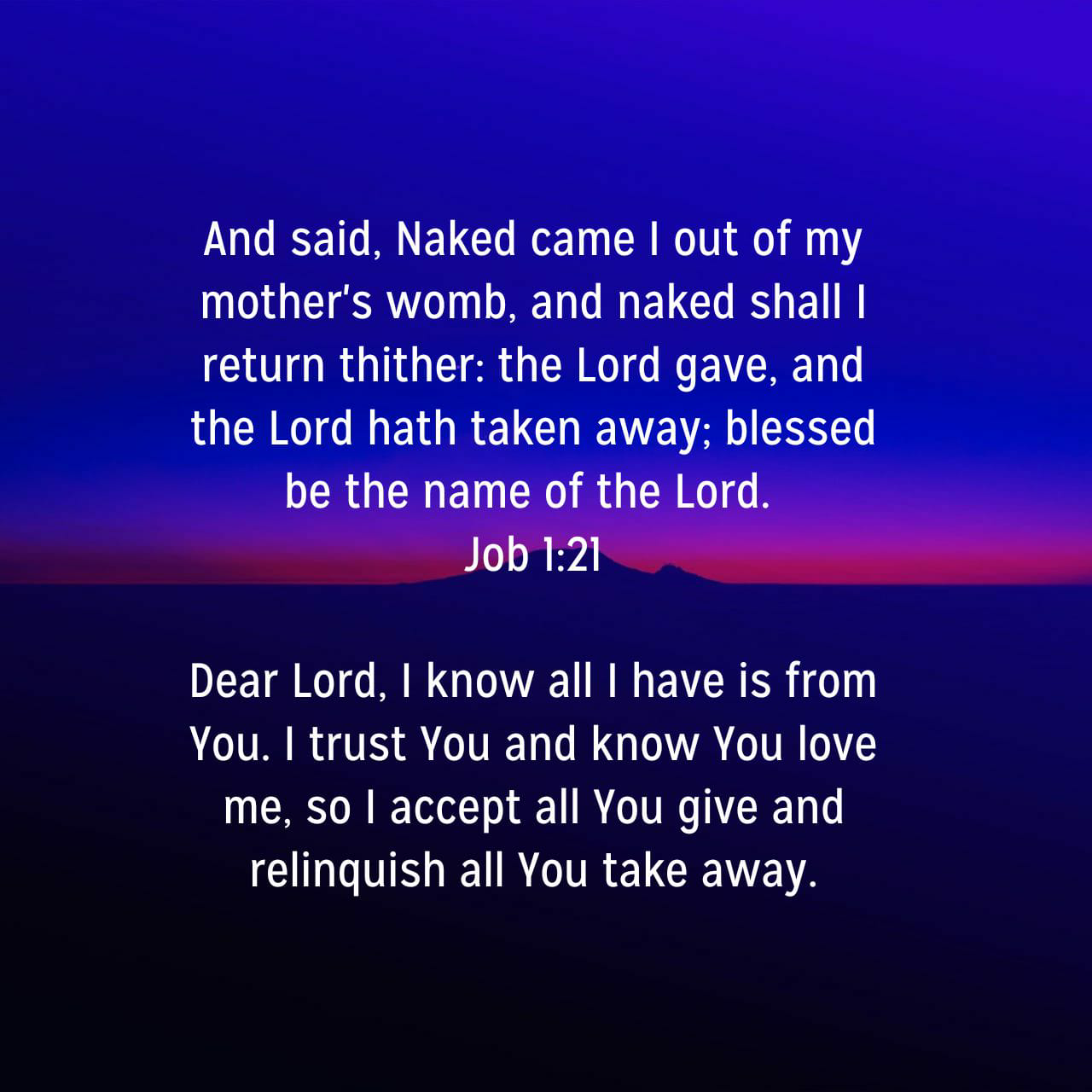 And said, Naked came I out of my mother’s womb, and naked shall I return thither: the Lord gave, and the Lord hath taken away; blessed be the name of the Lord . Job 1:21 KJV https://bible.com/bible/1/job.1.21.KJV