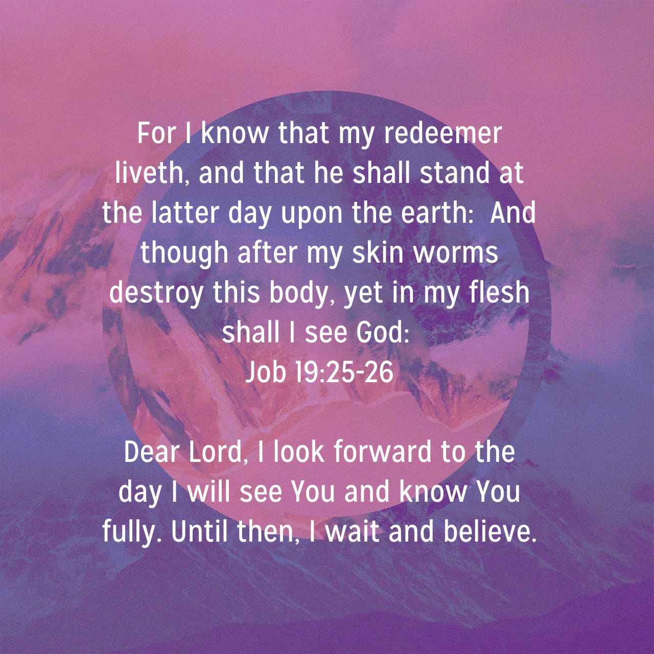 For I know that my redeemer liveth, and that he shall stand at the latter day upon the earth: And though after my skin worms destroy this body, yet in my flesh shall I see God: Job 19:25-26 KJV https://bible.com/bible/1/job.19.25-26.KJV