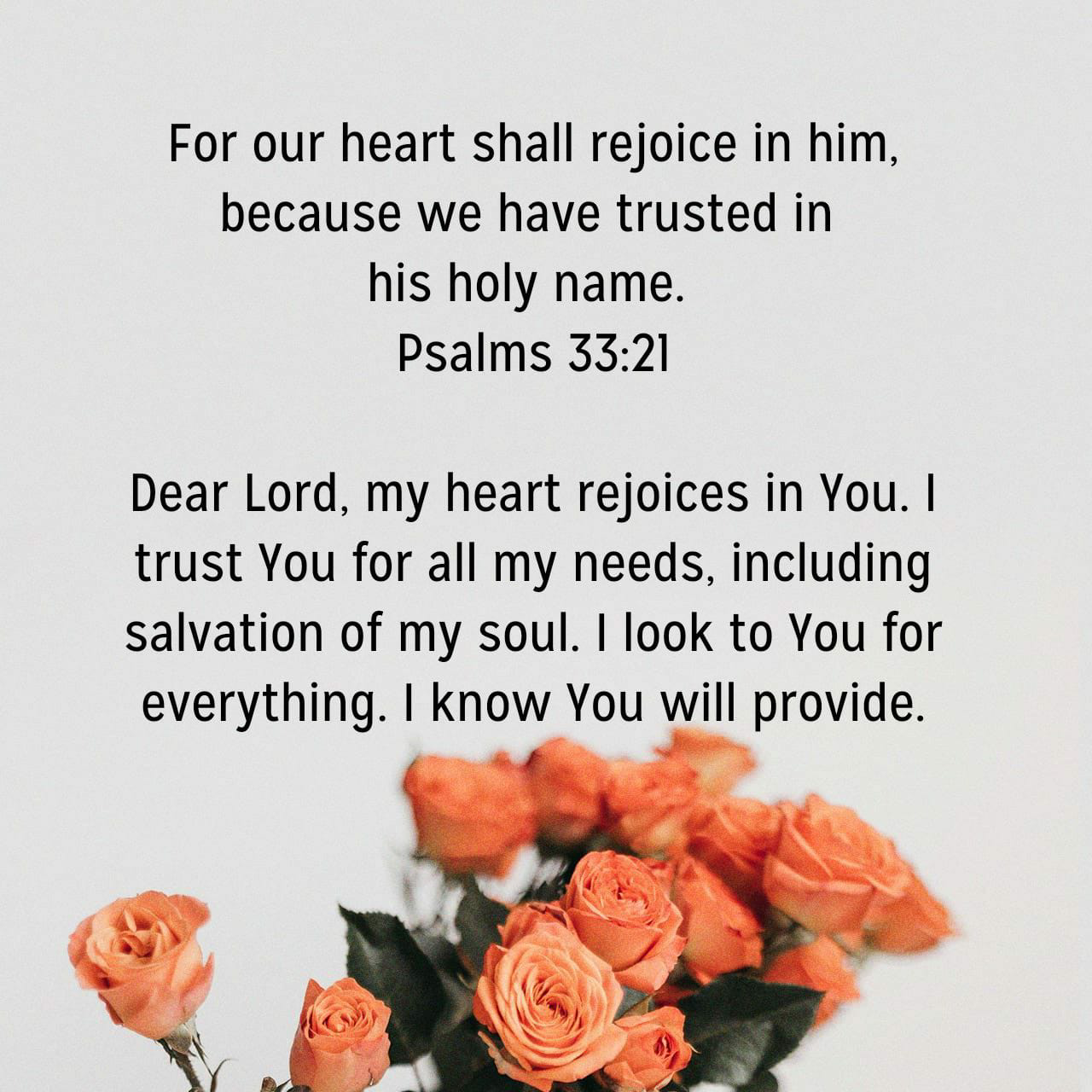 For our heart shall rejoice in him, because we have trusted in his holy name. Psalms 33:21 KJV https://bible.com/bible/1/psa.33.21.KJV