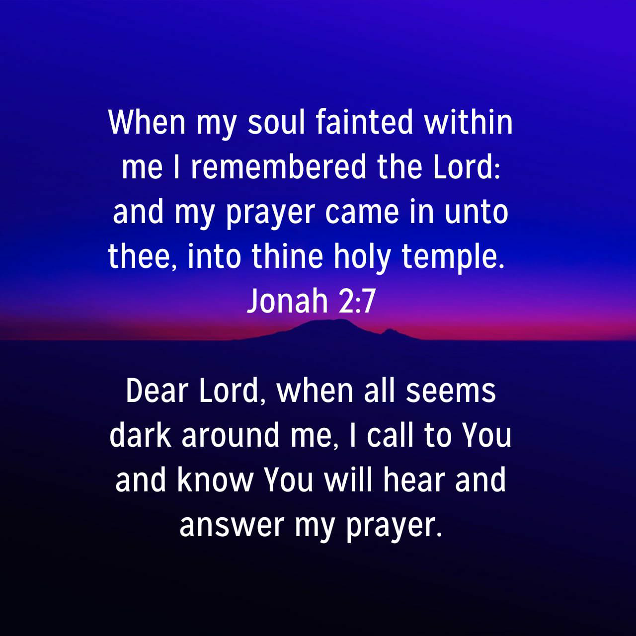 When my soul fainted within me I remembered the Lord : and my prayer came in unto thee, into thine holy temple. Jonah 2:7 KJV https://bible.com/bible/1/jon.2.7.KJV