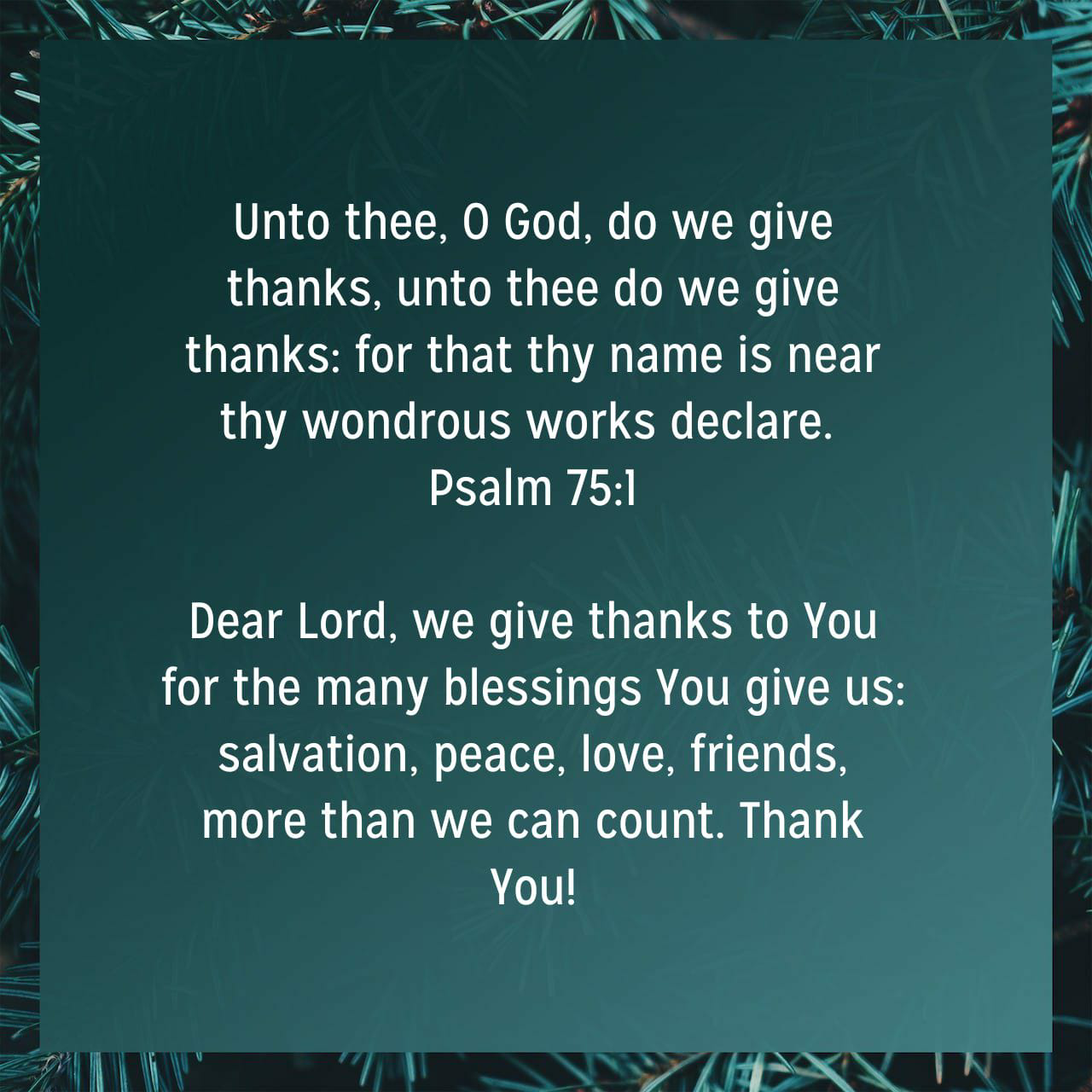 Unto thee, O God, do we give thanks, unto thee do we give thanks: for that thy name is near thy wondrous works declare. Psalm 75:1 KJV https://bible.com/bible/1/psa.75.1.KJV