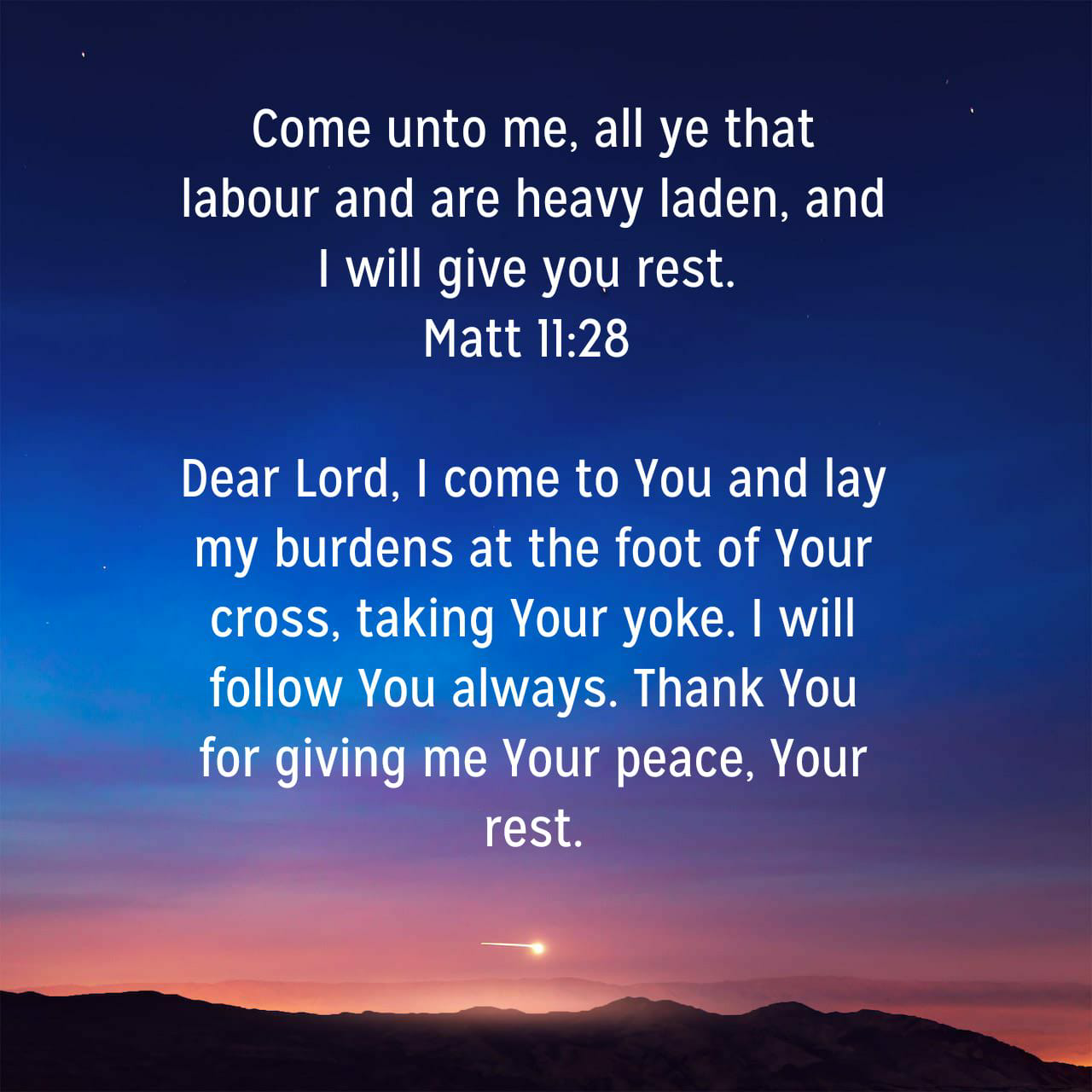 28 Come unto me, all ye that labour and are heavy laden, and I will give you rest. Matt 11:28 KJV https://bible.com/bible/1/mat.11.28.KJV