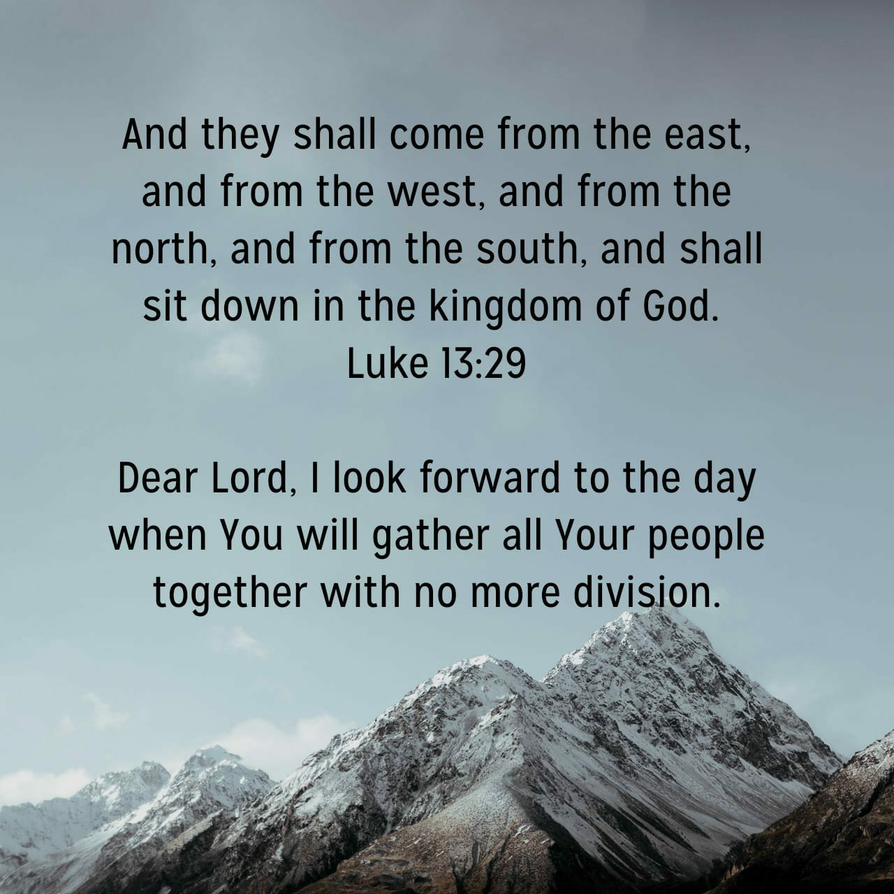 29 And they shall come from the east, and from the west, and from the north, and from the south, and shall sit down in the kingdom of God. Luke 13:29 KJV https://bible.com/bible/1/luk.13.29.KJV