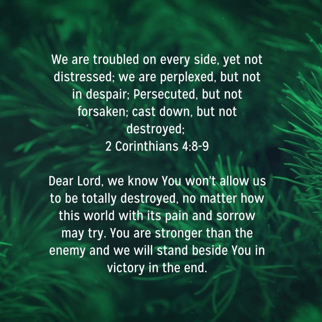 8 We are troubled on every side, yet not distressed; we are perplexed, but not in despair; 9 Persecuted, but not forsaken; cast down, but not destroyed; 2 Corinthians 4:8-9 KJV https://bible.com/bible/1/2co.4.8-9.KJV