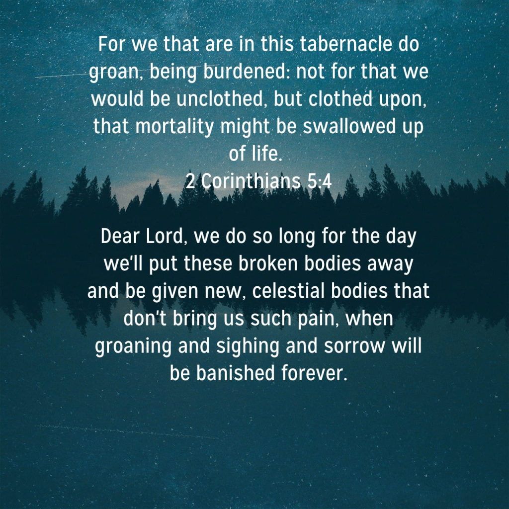 4 For we that are in this tabernacle do groan, being burdened: not for that we would be unclothed, but clothed upon, that mortality might be swallowed up of life. 2 Corinthians 5:4 KJV https://bible.com/bible/1/2co.5.4.KJV