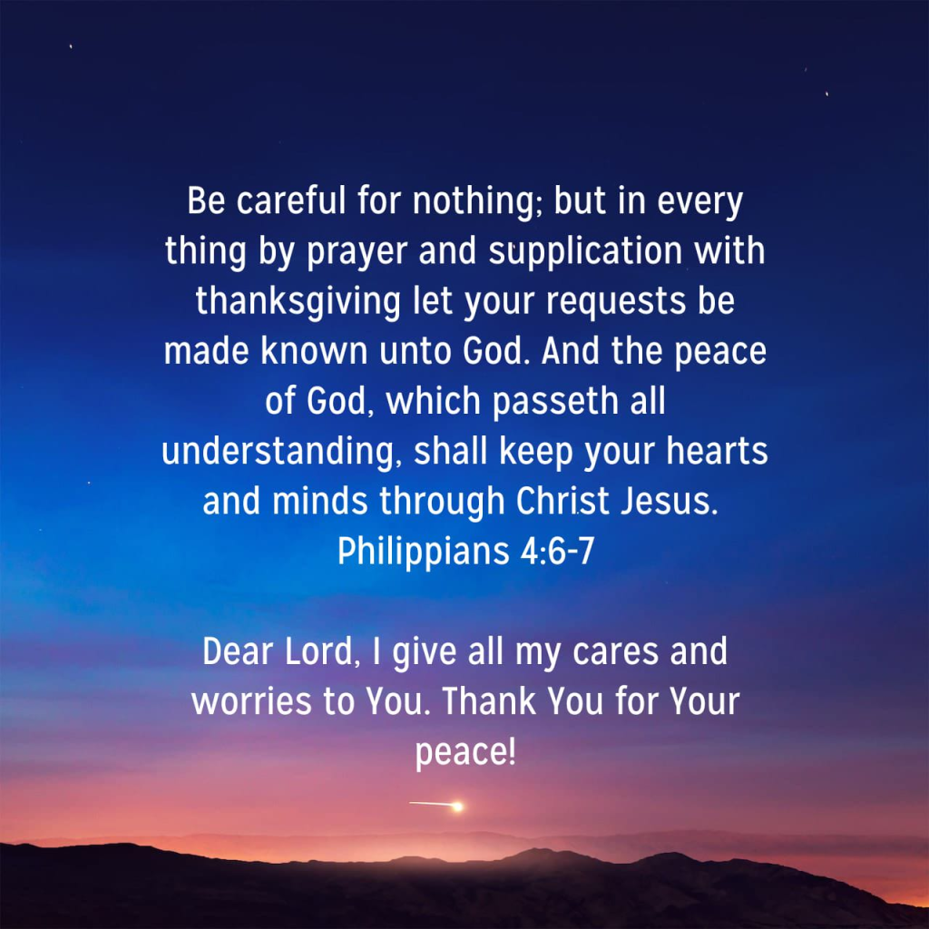 6 Be careful for nothing; but in every thing by prayer and supplication with thanksgiving let your requests be made known unto God. 7 And the peace of God, which passeth all understanding, shall keep your hearts and minds through Christ Jesus. Philippians 4:6-7 KJV https://bible.com/bible/1/php.4.6-7.KJV