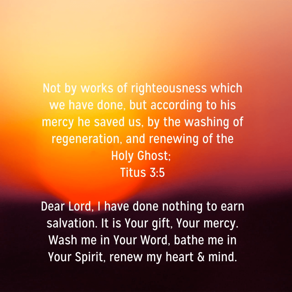 5 Not by works of righteousness which we have done, but according to his mercy he saved us, by the washing of regeneration, and renewing of the Holy Ghost; Titus 3:5 KJV https://bible.com/bible/1/tit.3.5.KJV