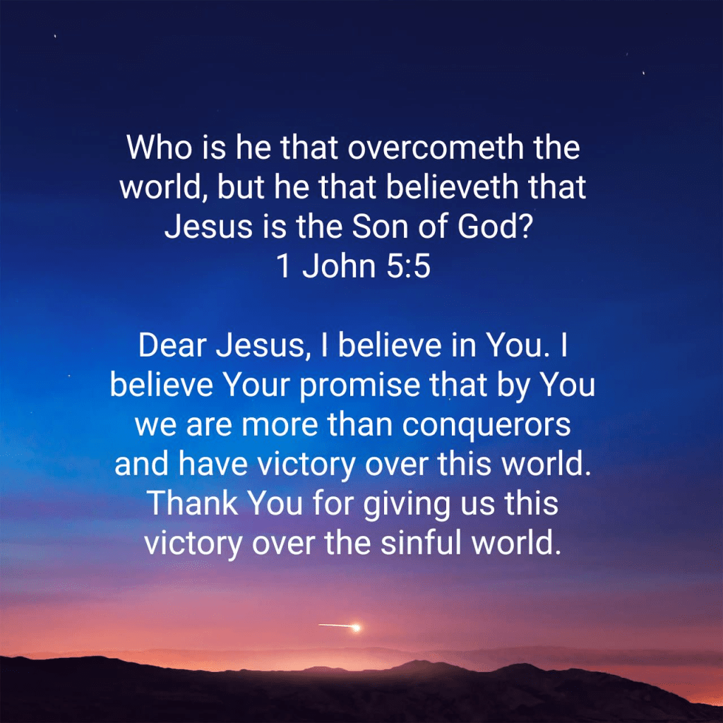 Who is he that overcometh the world, but he that believeth that Jesus is the Son of God? 1 John 5:5 KJV https://bible.com/bible/1/1jn.5.5.KJV