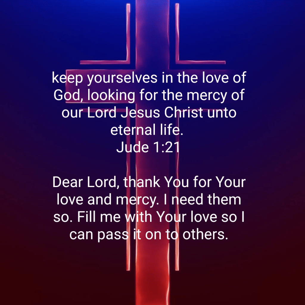 keep yourselves in the love of God, looking for the mercy of our Lord Jesus Christ unto eternal life. Jude 1:21 KJV https://bible.com/bible/1/jud.1.21.KJV