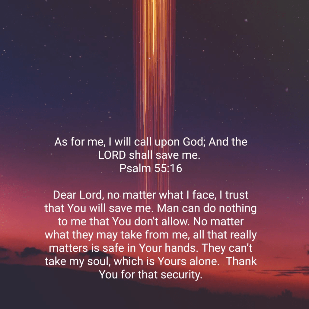 As for me, I will call upon God; And the LORD shall save me. Psalm 55:16 KJV https://bible.com/bible/1/psa.55.16.KJV