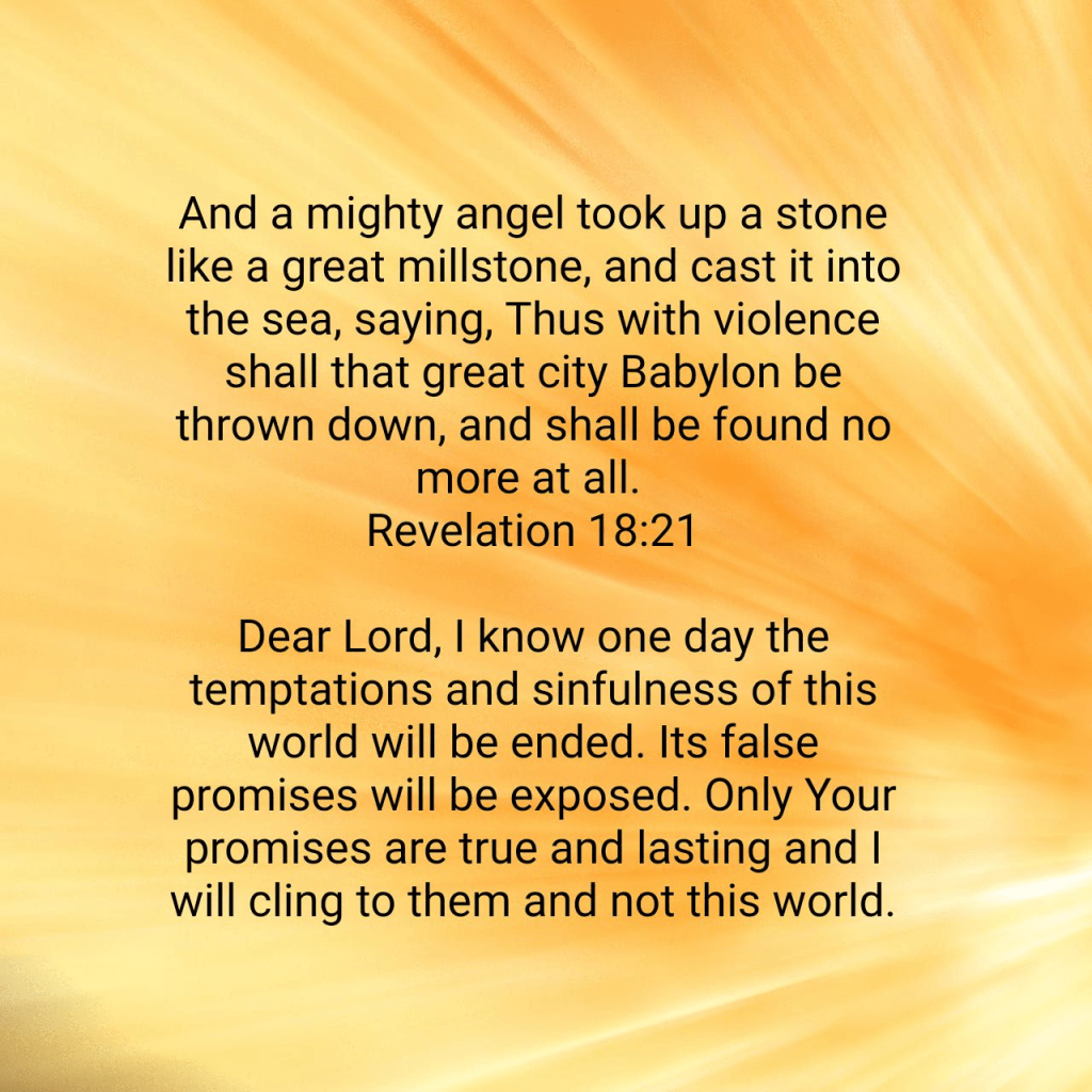 And a mighty angel took up a stone like a great millstone, and cast it into the sea, saying, Thus with violence shall that great city Babylon be thrown down, and shall be found no more at all. Revelation 18:21 KJV https://bible.com/bible/1/rev.18.21.KJV