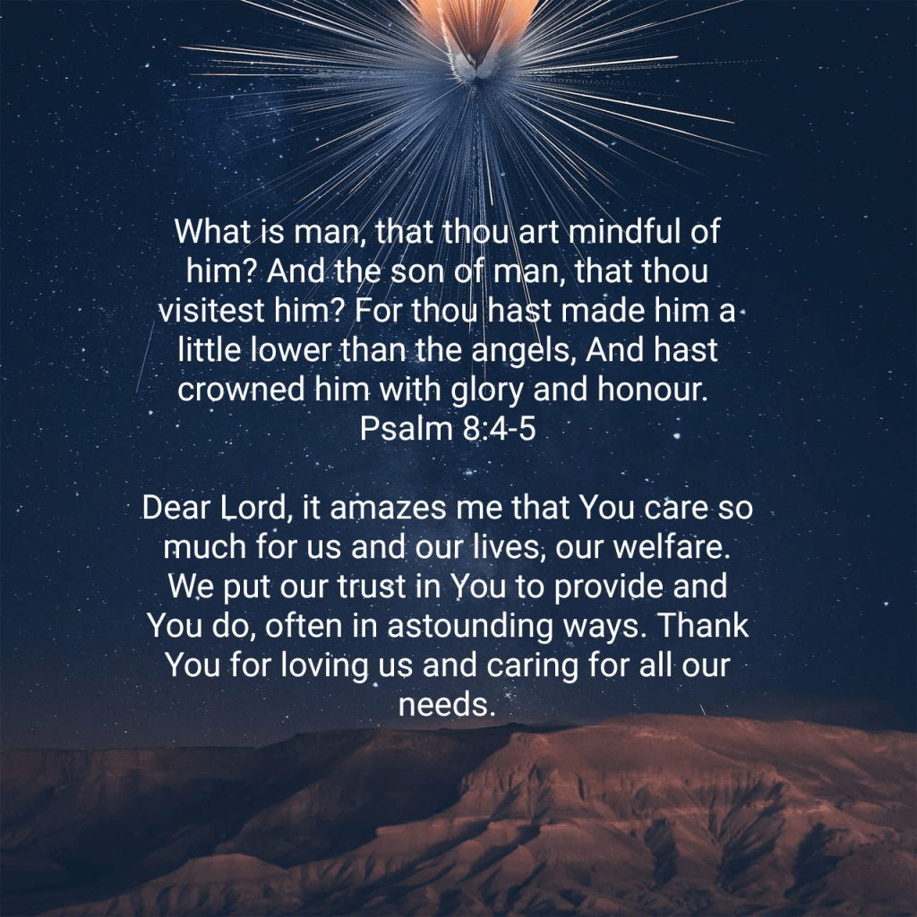 What is man, that thou art mindful of him? And the son of man, that thou visitest him? For thou hast made him a little lower than the angels, And hast crowned him with glory and honour. Psalm 8:4-5 KJV https://bible.com/bible/1/psa.8.4-5.KJV