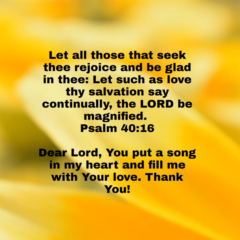 Let all those that seek thee rejoice and be glad in thee: Let such as love thy salvation say continually, the LORD be magnified. Psalm 40:16 KJV https://bible.com/bible/1/psa.40.16.KJV