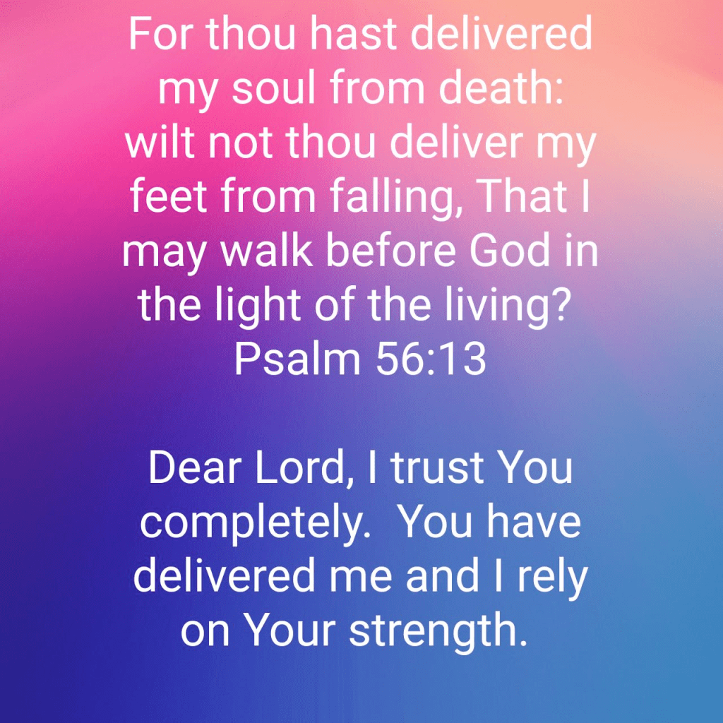 For thou hast delivered my soul from death: wilt not thou deliver my feet from falling, That I may walk before God in the light of the living? Psalm 56:13 KJV https://bible.com/bible/1/psa.56.13.KJV