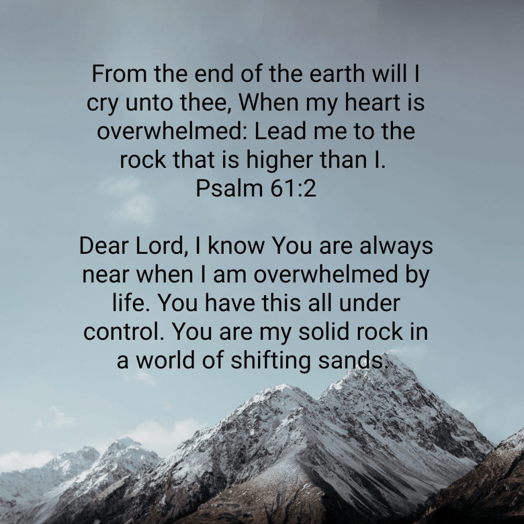 From the end of the earth will I cry unto thee, When my heart is overwhelmed: Lead me to the rock that is higher than I. Psalm 61:2 KJV https://bible.com/bible/1/psa.61.2.KJV