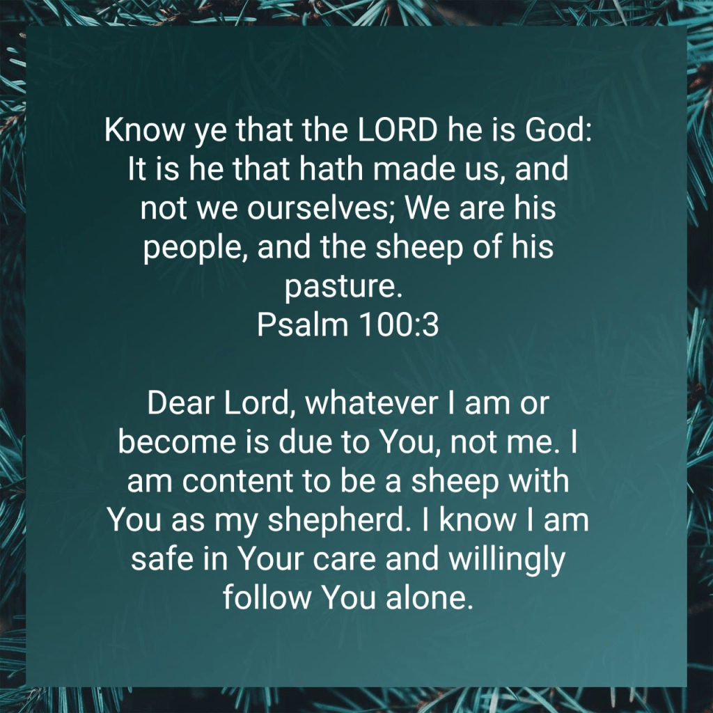 Know ye that the LORD he is God: It is he that hath made us, and not we ourselves; We are his people, and the sheep of his pasture. Psalm 100:3 KJV https://bible.com/bible/1/psa.100.3.KJV