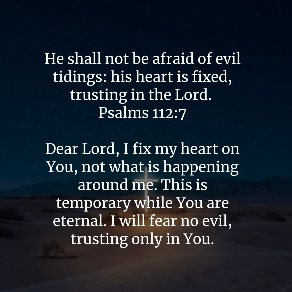 He shall not be afraid of evil tidings: His heart is fixed, trusting in the LORD. Psalm 112:7 KJV https://bible.com/bible/1/psa.112.7.KJV