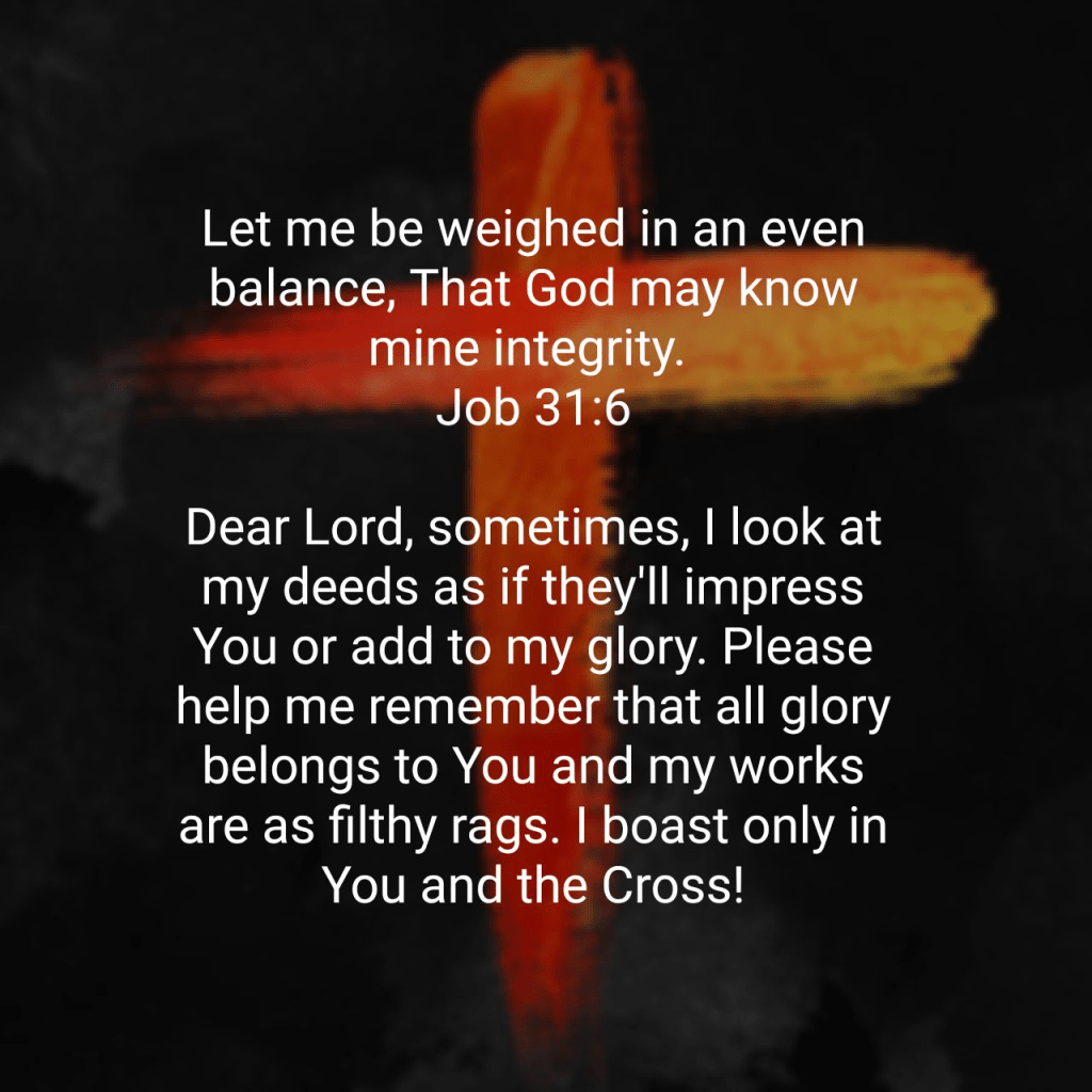 Let me be weighed in an even balance, That God may know mine integrity. Job 31:6 KJV https://bible.com/bible/1/job.31.6.KJV