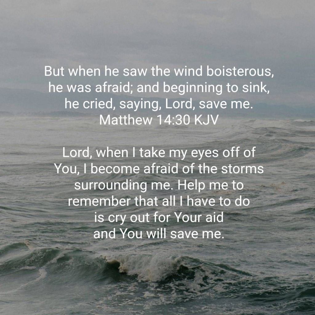 [30] But when he saw the wind boisterous, he was afraid; and beginning to sink, he cried, saying, Lord, save me.