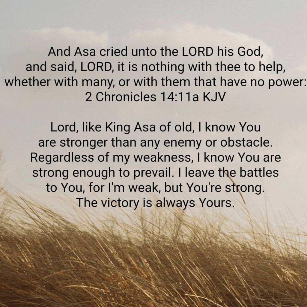 [11] And Asa cried unto the LORD his God, and said, LORD, it is nothing with thee to help, whether with many, or with them that have no power: help us, O LORD our God; for we rest on thee, and in thy name we go against this multitude. O LORD, thou art our God; let not man prevail against thee.