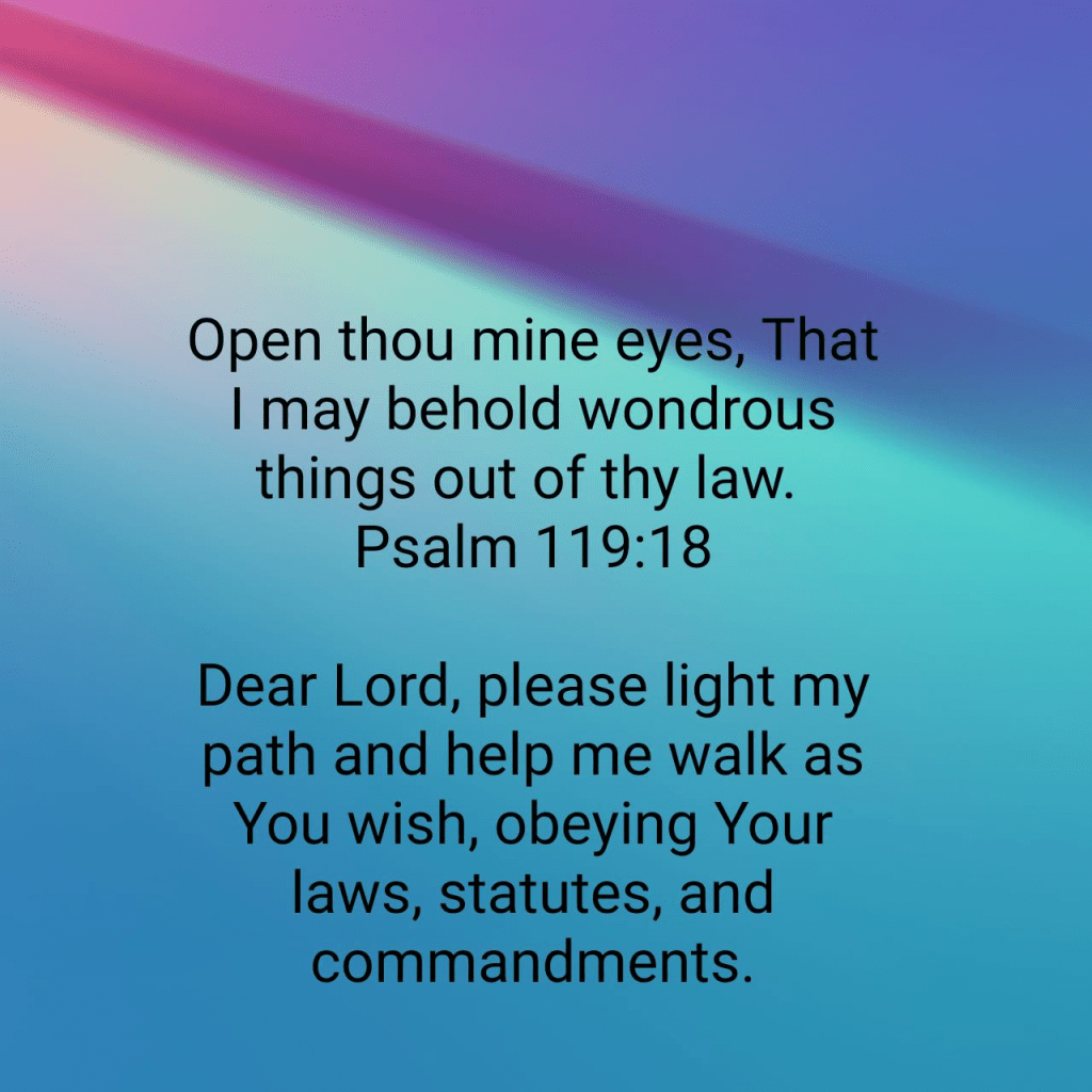 Open thou mine eyes, That I may behold wondrous things out of thy law. Psalm 119:18 KJV https://bible.com/bible/1/psa.119.18.KJV
